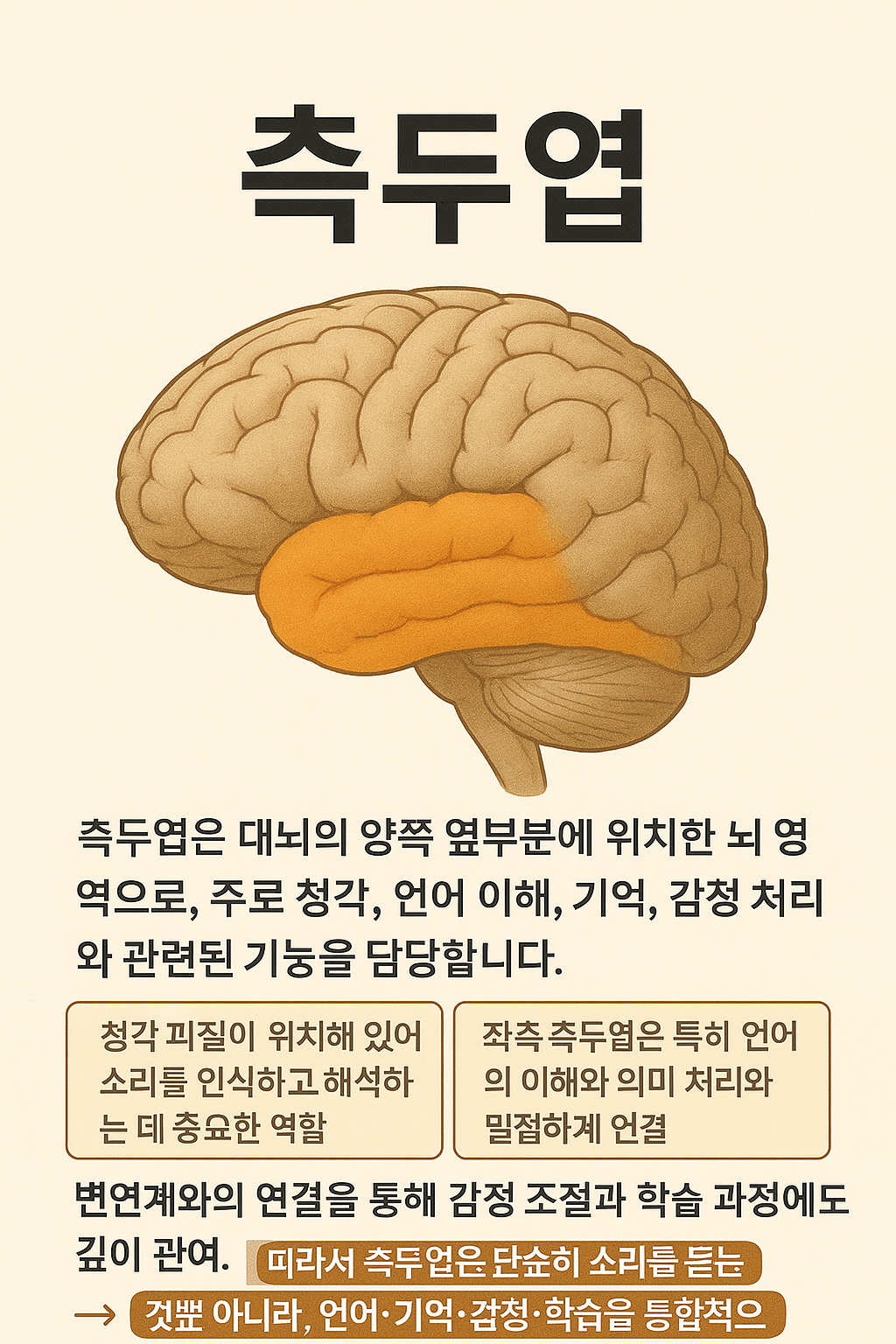 따라서 측두엽은 단순히 소리를 듣는 것뿐 아니라, 언어·기억·감정·학습을 통합적으로 다루는 뇌의 중요한 허브라고 할 수 있습니다.