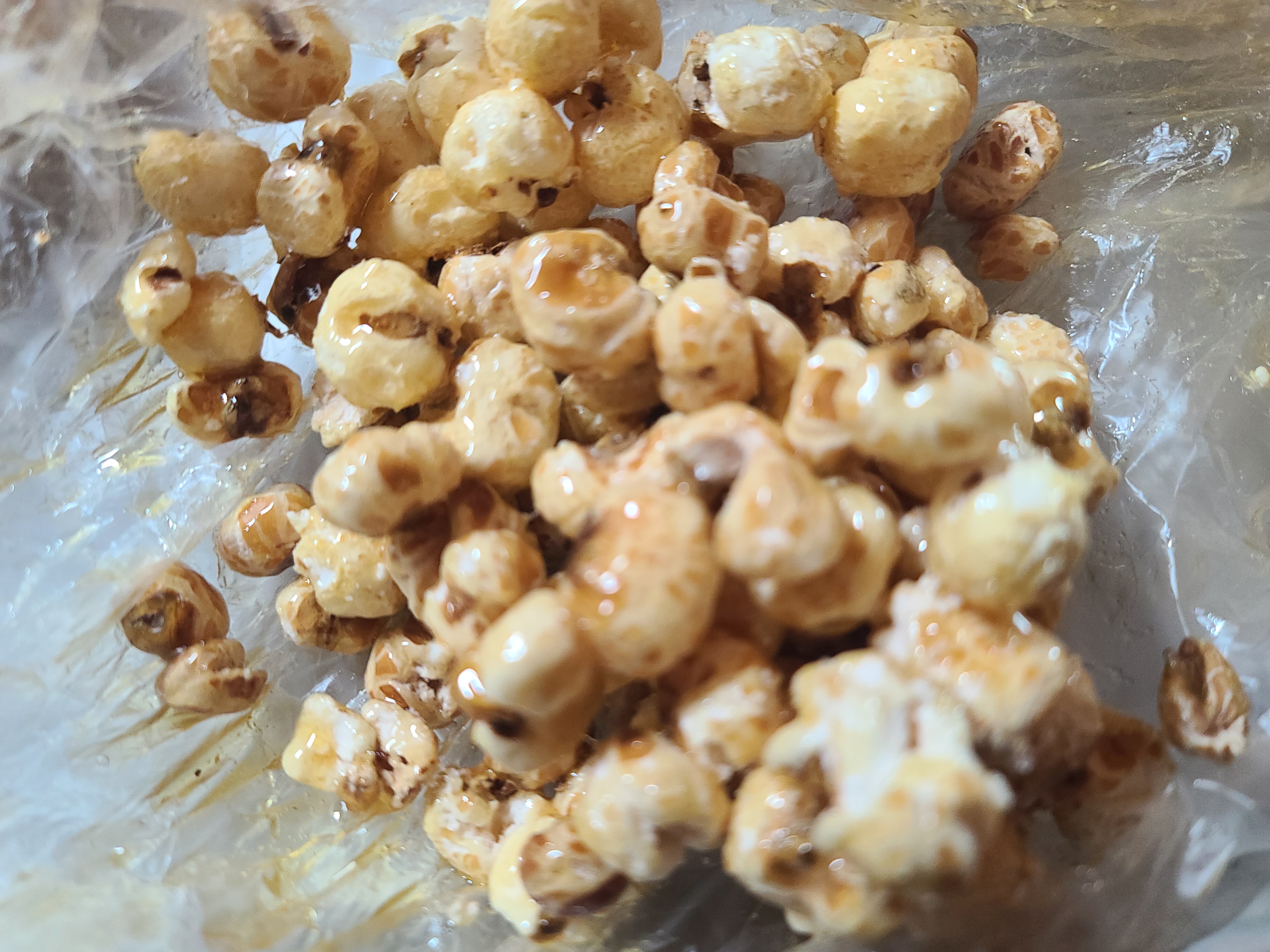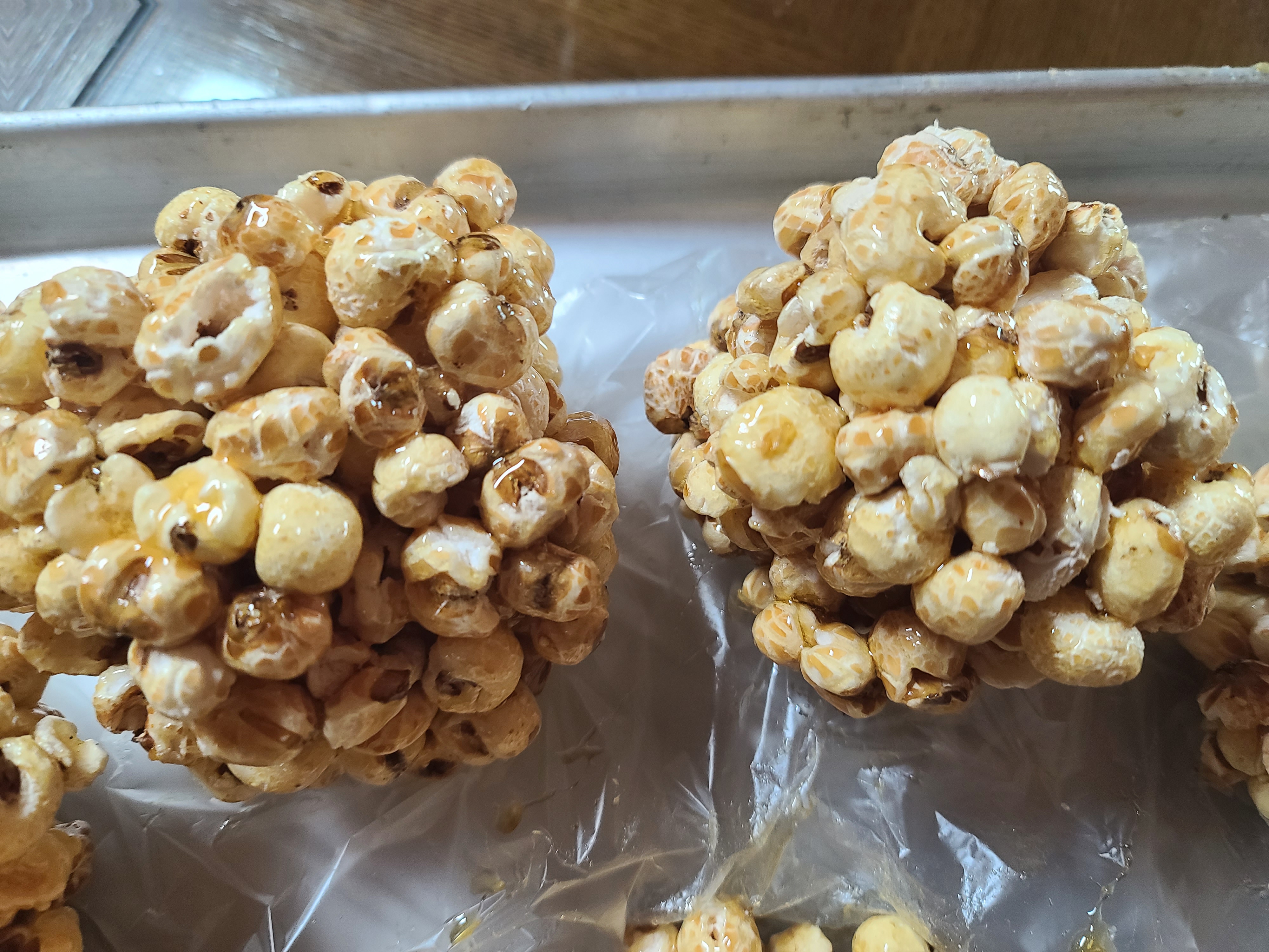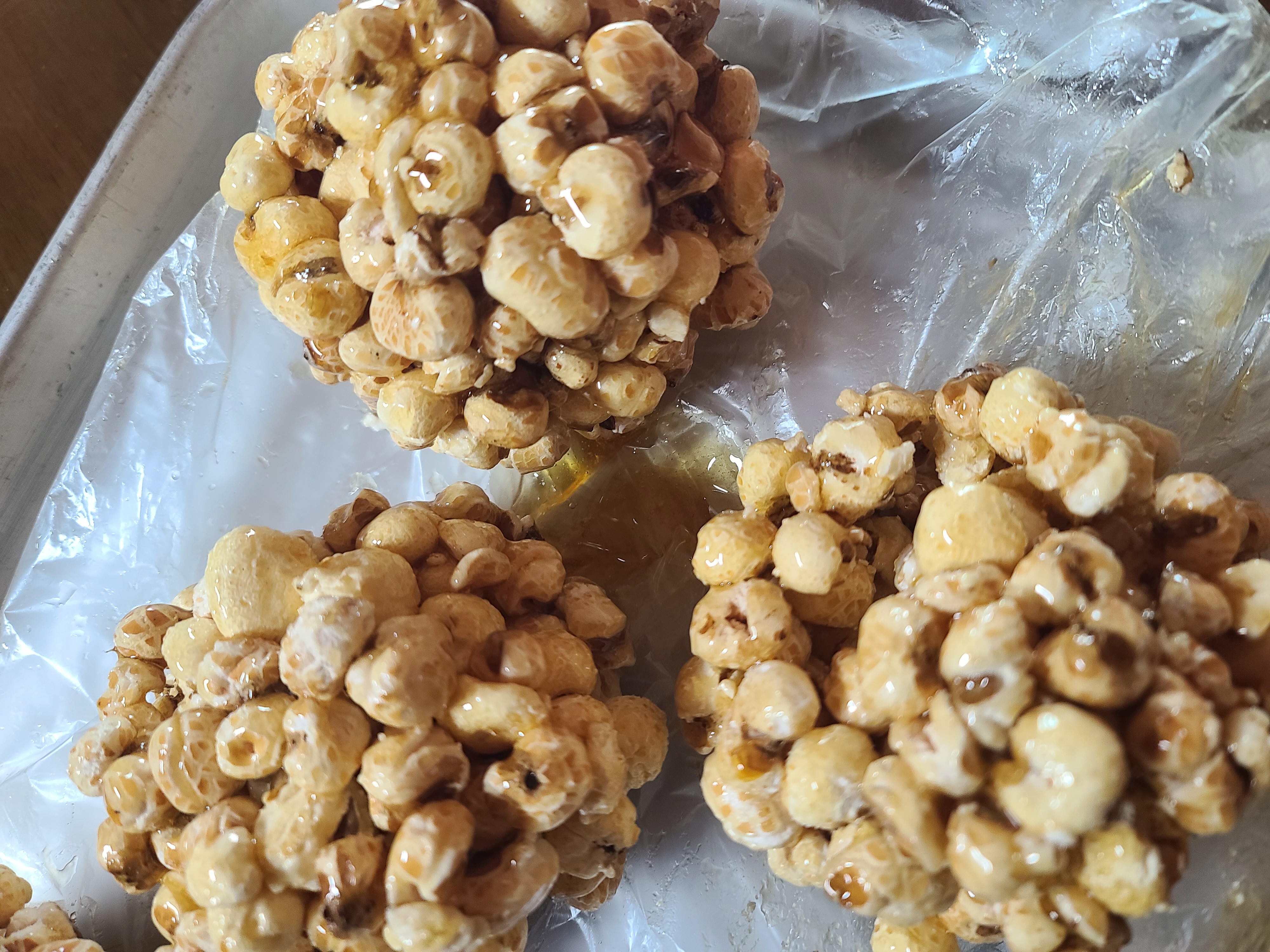 옥수수 뻥튀기와 쌀 뻥튀기에 조청을 넣어 주먹밥 모양으로 뭉쳐보았다.