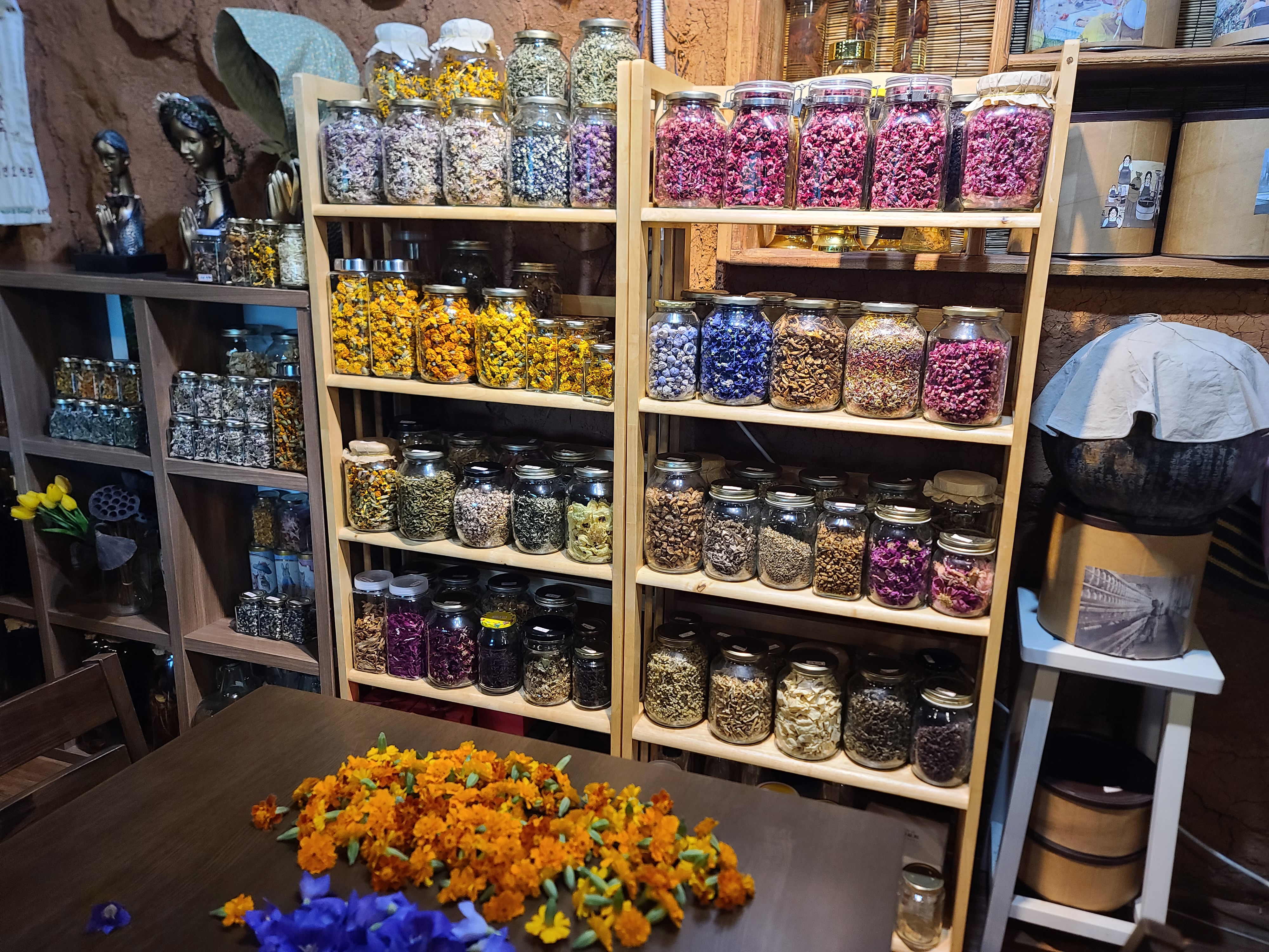 커피숍 안에 들어서자 또 다른 감탄이 터졌다. 건조한 꽃들이 가지런히 진열되어 있었는데, 꽃차로 우리기 위해 판매하는 것들이었다. 보는 것만으로도 마음이 황홀해졌다.