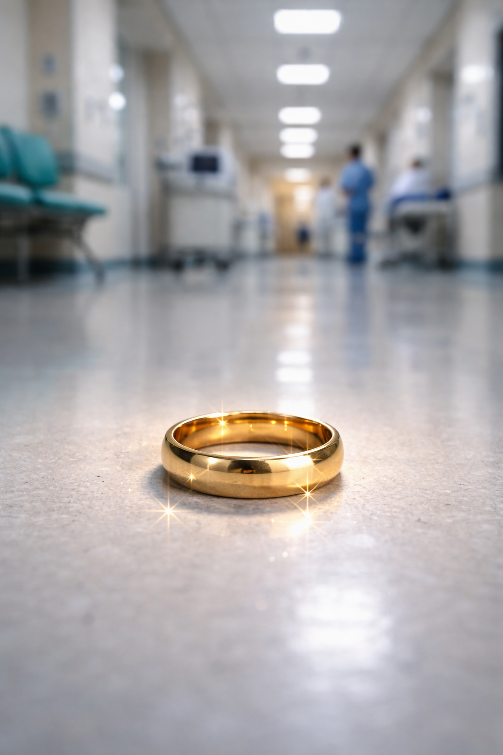병원 바닥 위에 떨어진 반짝이는 금반지